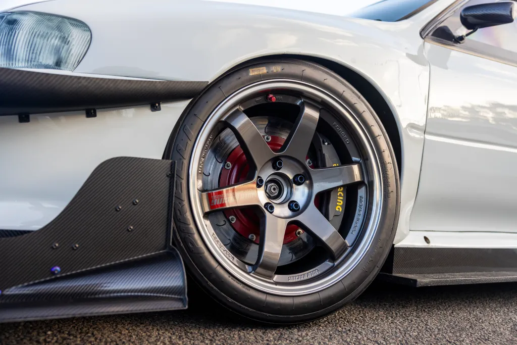 The transmission features a Samsonas six-speed sequential gearbox paired with an Xtreme triple-plate clutch, Driveshaft Shop front and rear shafts, and a custom-length carbon prop shaft. Power distribution is handled by a Cusco RS 1.5-way differential described as clunky and aggressive - perfectly suited to this focused build.