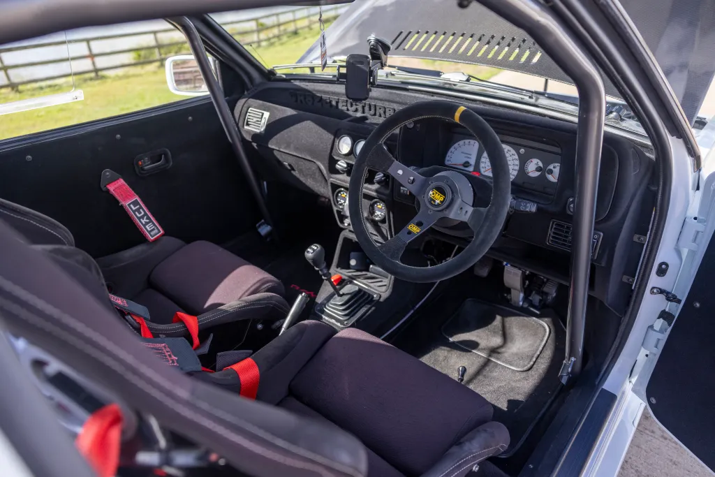 The cabin balances stripped-out aggression with period-correct aesthetics. Damaged flocked components from the initial build were replaced with assistance from Frank Flock, while Chris fabricated the door cards himself. A full roll cage replaces the previous half-cage arrangement, finished to match the wheels and providing serious competition credentials.