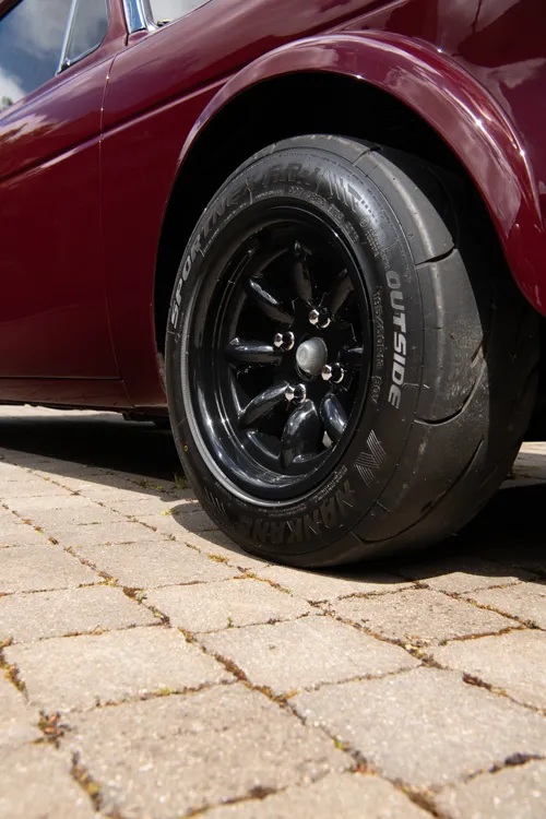 The current JBW wheels emulate classic Two Gates designs and suit the car perfectly with their traditional spoke pattern. Practicality influenced the switch to Nankang tyres after previous Yokohamas flicked stones during driving. Future plans include fitting genuine refurbished Two Gates wheels of identical size and offset, maintaining the perfect stance while achieving ultimate authenticity.